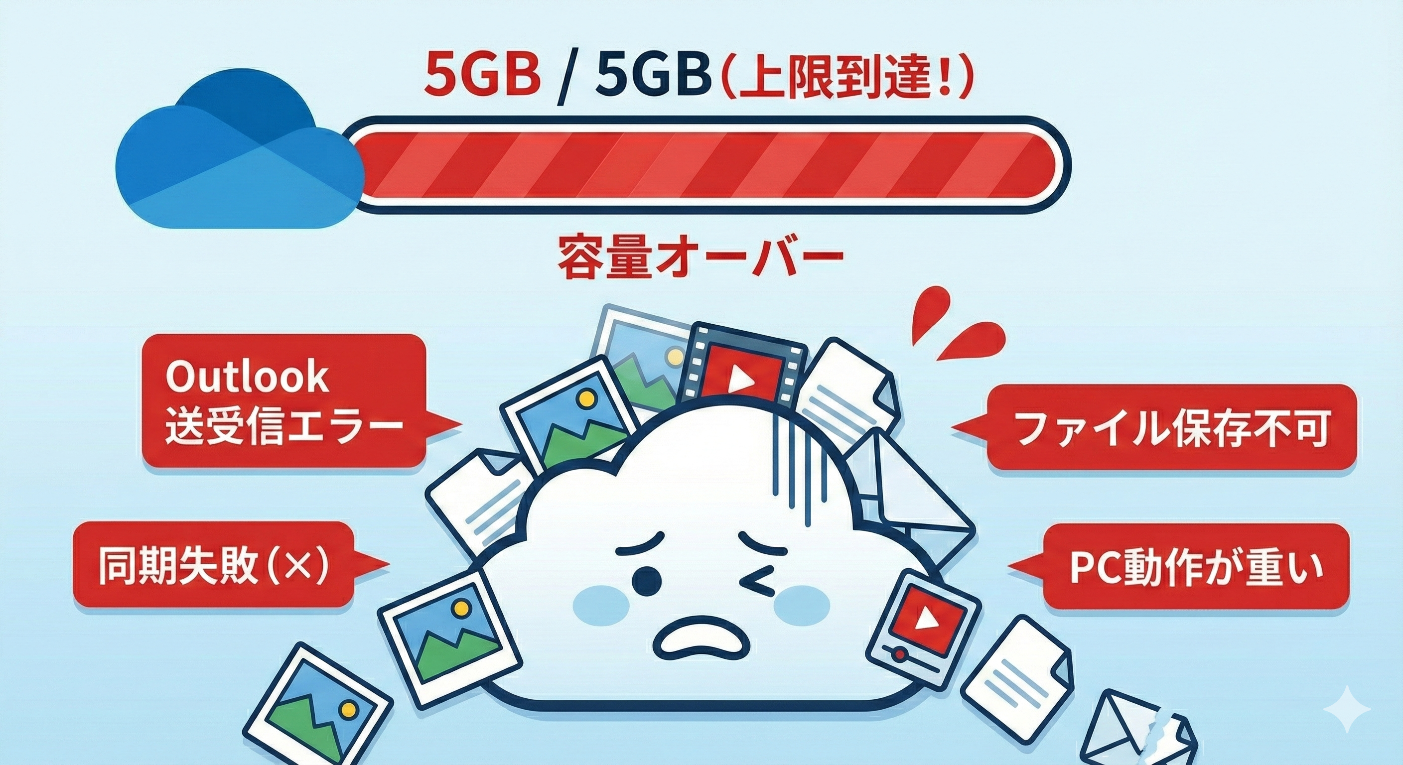 特に Outlook は OneDrive と密接につながっているため、容量エラーが起きるとメールが急に止まることがよくあります。